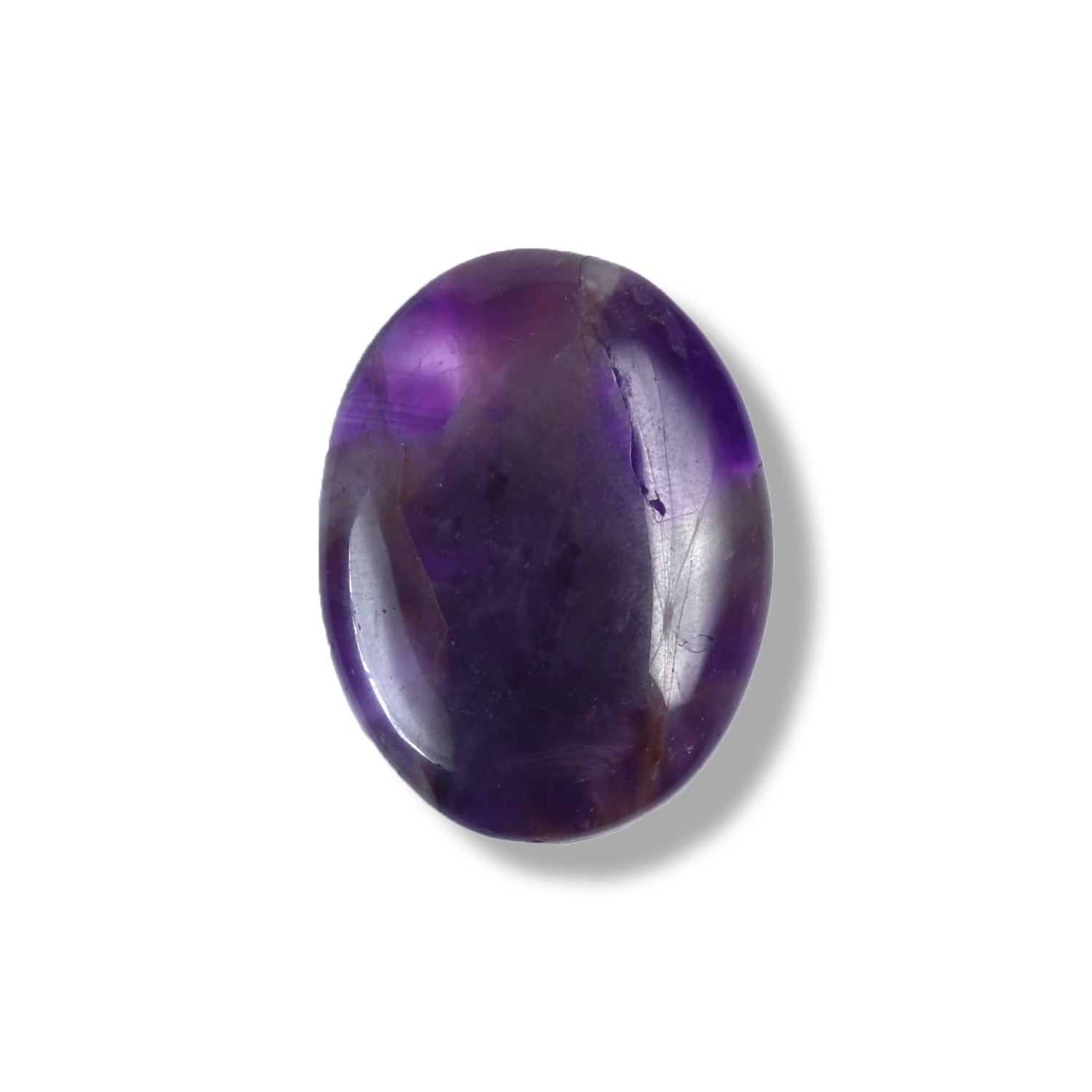 A polished Amethyst oval cab that radiates calming purple hues and serene energy for spiritual clarity and emotional balance.