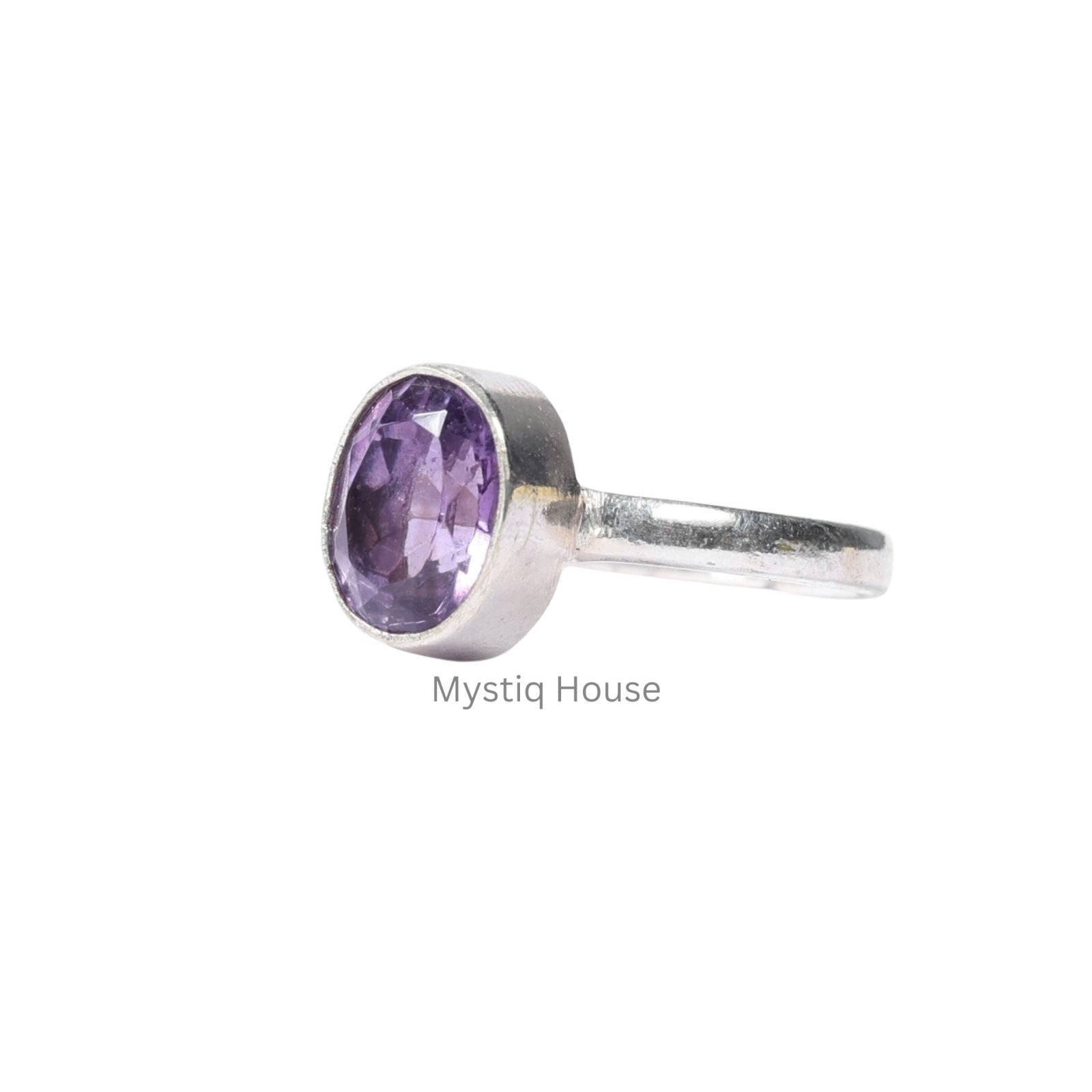 Buy online our Amethyst Pure Silver Ring from Mystiq House at the best price —a healing crystal, natural stone jewelry piece featuring a stunning amethyst oval gemstone with a deep purple hue. Securely set in pure silver and fully adjustable, this elegant ring is designed for a perfect fit.