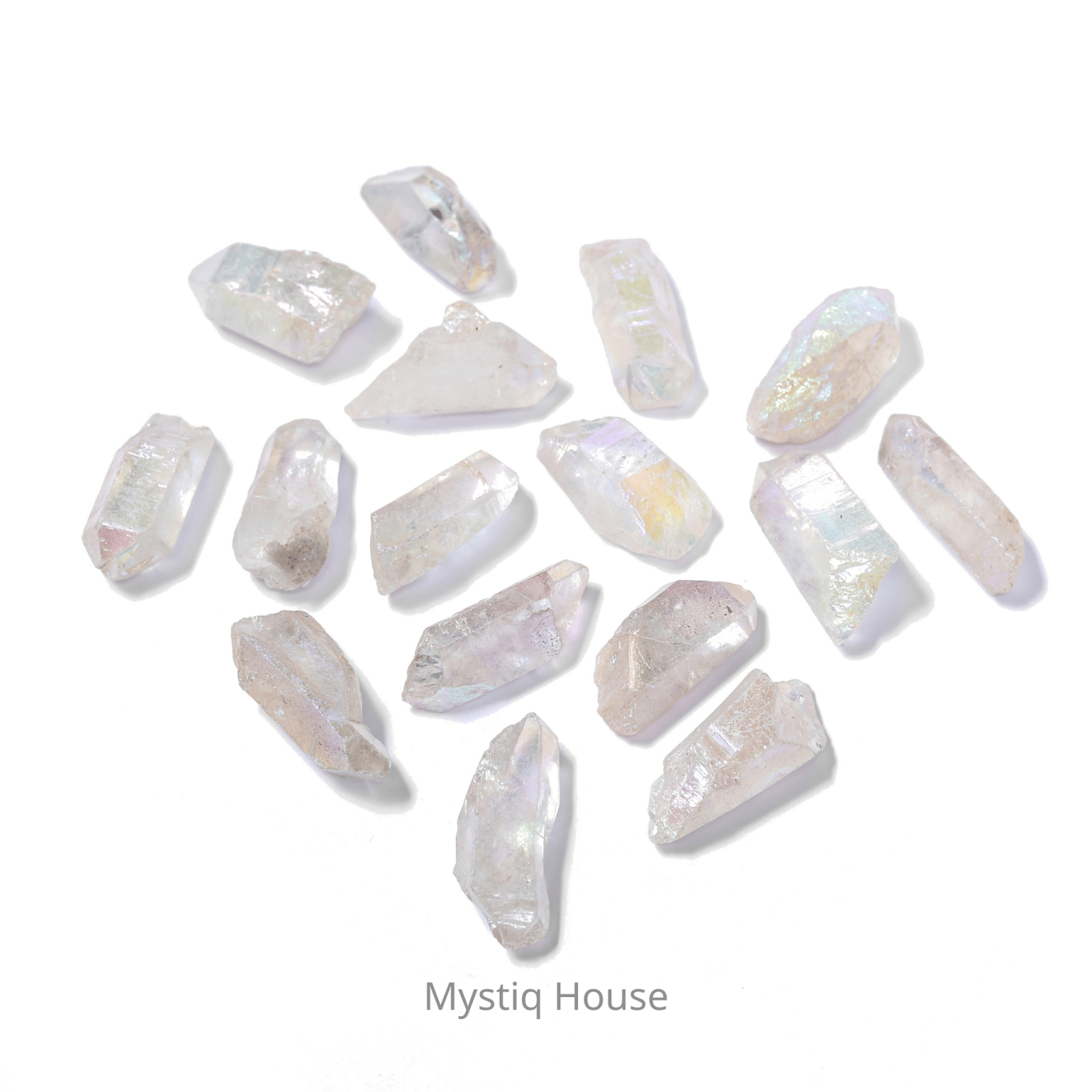 1.Buy Angel Aura Quartz Points online at the best price from Mystiq House. Created by bonding clear quartz with platinum, these natural points emit a serene and peaceful energy. 2.Perfect for Reiki healing, Vastu, and Feng Shui practices, they support meditation, energy grids, and spiritual connections. Experience the power of this 100% original crystal gemstone today!