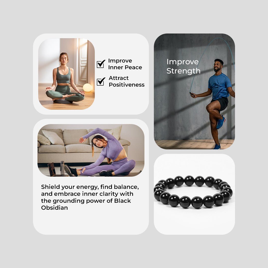 1. The Black Obsidian Bracelet features polished black obsidian stones, known for their sleek and dark appearance.