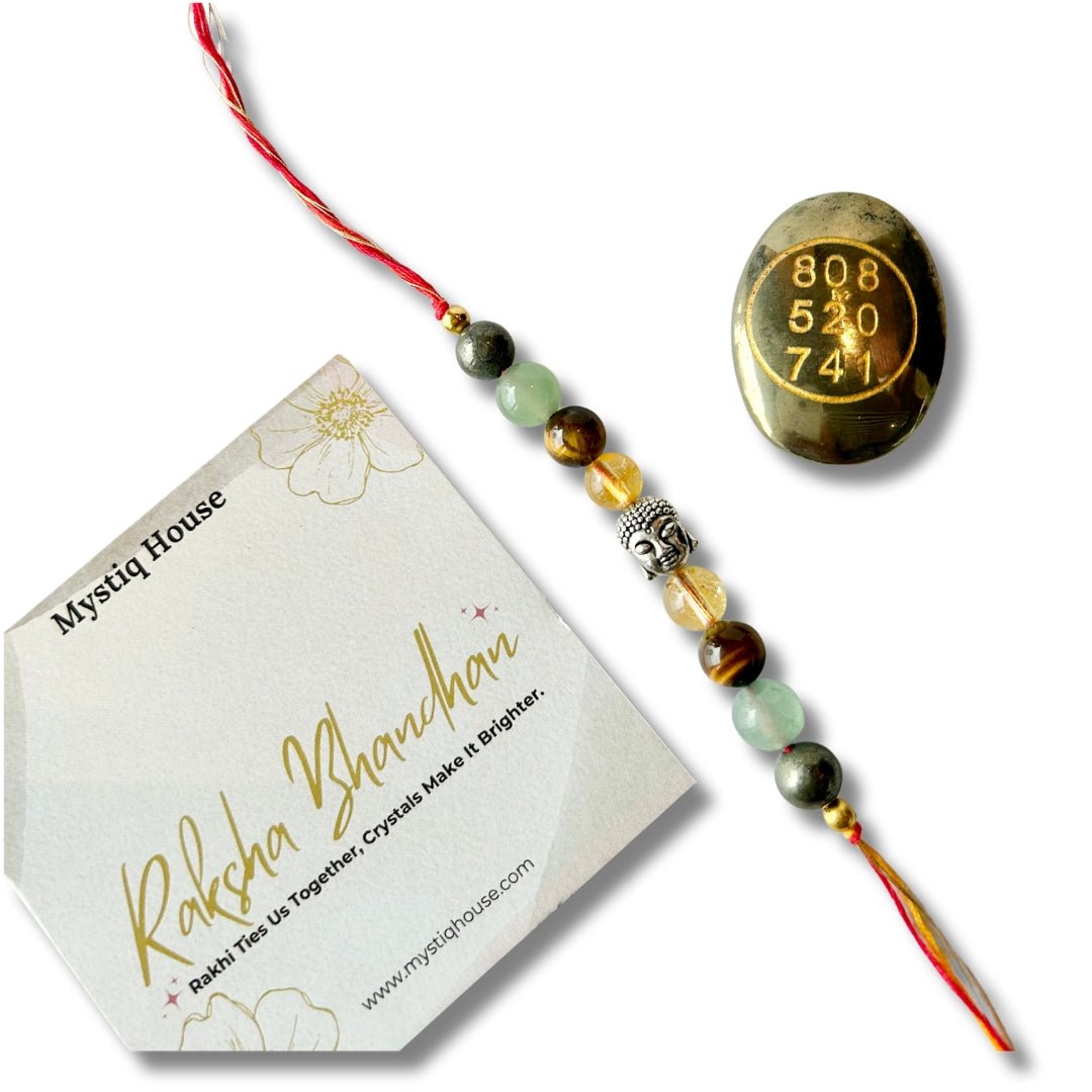 1. A Rakhi That Grows With Him Celebrate Raksha Bandhan with abundance and intention through the Combination of Wealth Rakhi & Pyrite Money Switch Cabochon from MystiqHouse. Our Rakhi is made using Pyrite, citrine, Tiger Eye & Green Aventurine–all carefully chosen to unlock prosperity,confidence, and energetic protection, while the pyrite money switch cabochon is engraved with 808 520 741 spiritual formula to activate abundance and open financial flow. Give your brother a wearable blessing with a powerful keepsake that works in tandem with his dreams and ambitions. Buy online to share prosperity and protection with your brother.