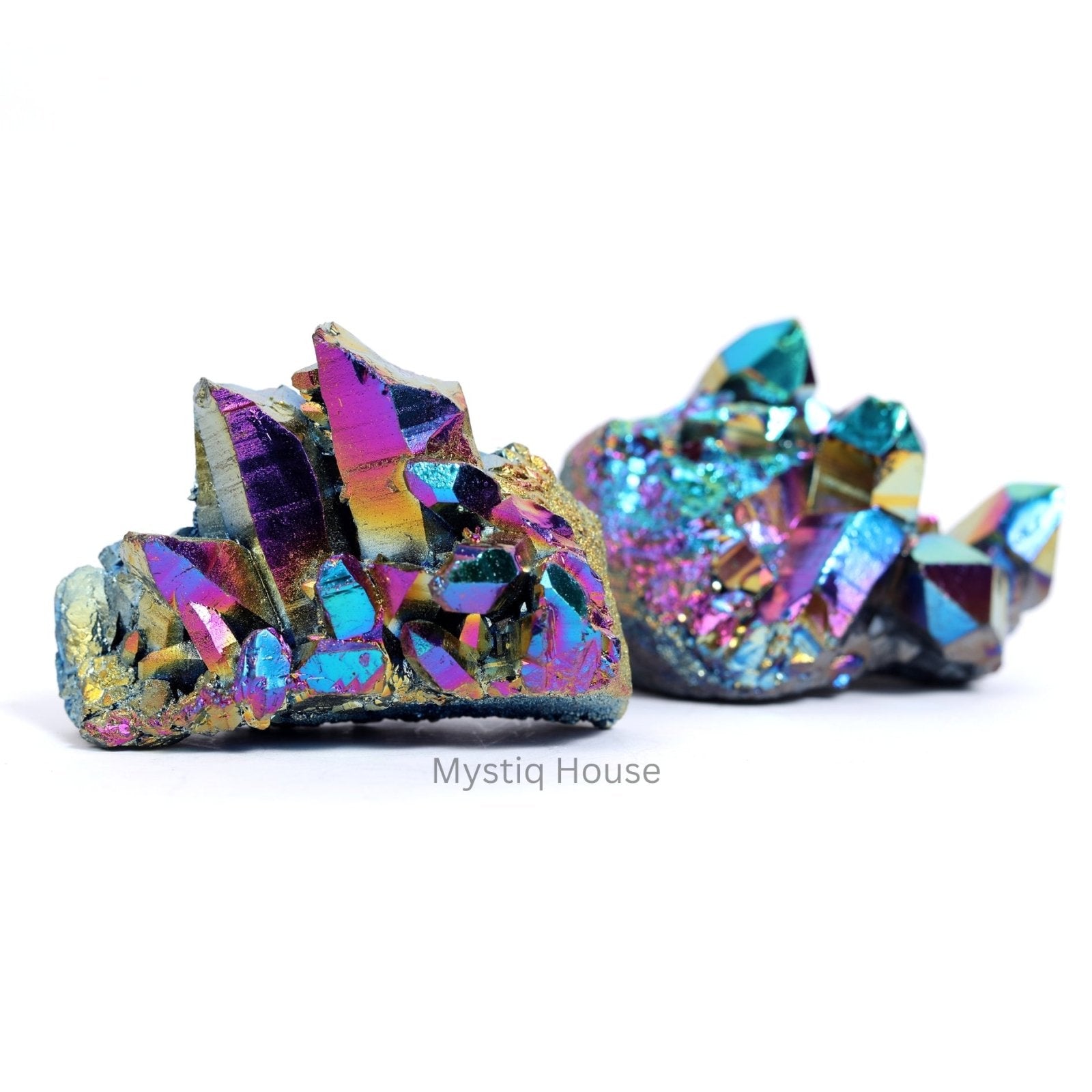 A titanium aqua aura quartz cluster is believed to promote tranquility, communication, and spiritual growth.
