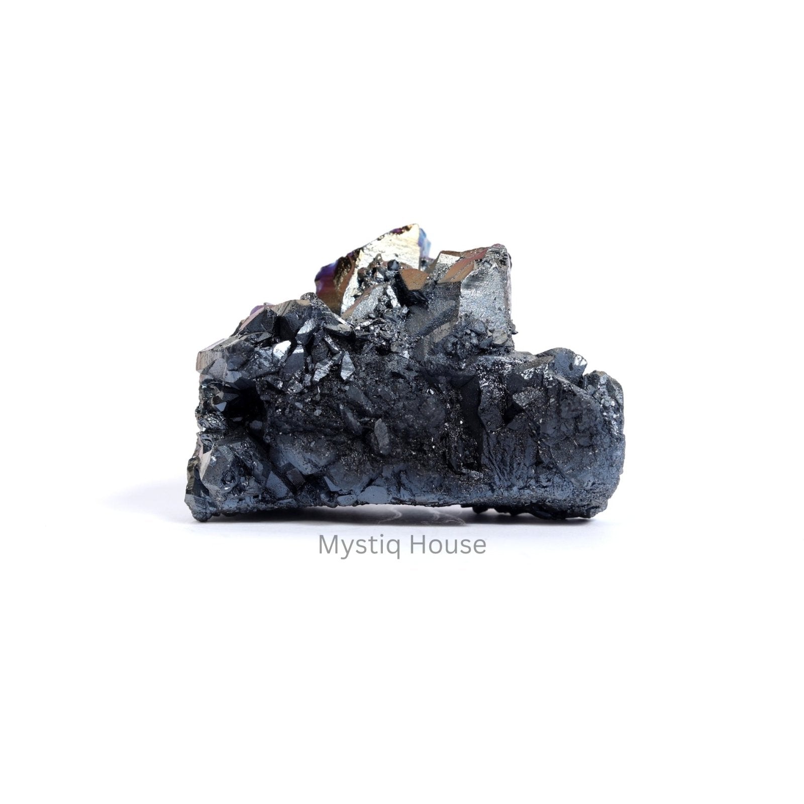 3. The cluster has a stunning iridescent sheen with blue and rainbow hues.