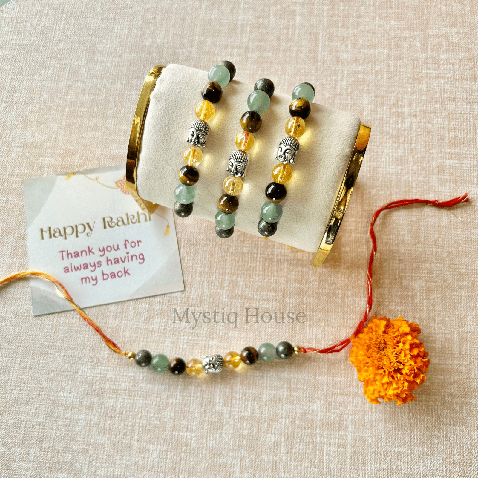 5. Buy online our handcrafted wealth rakhi featuring a healing crystal combination of natural stones including Citrine, Pyrite, Green Aventurine, and Tiger Eye. Each stone is carefully selected for its association with prosperity, luck, and confidence. This vibrant, stunning jewelry piece symbolizes love and protection, making it perfect for celebrating Raksha Bandhan. Order yours today!